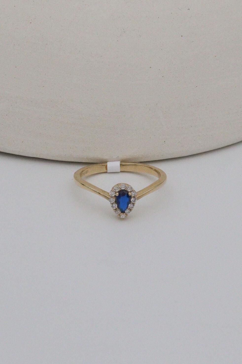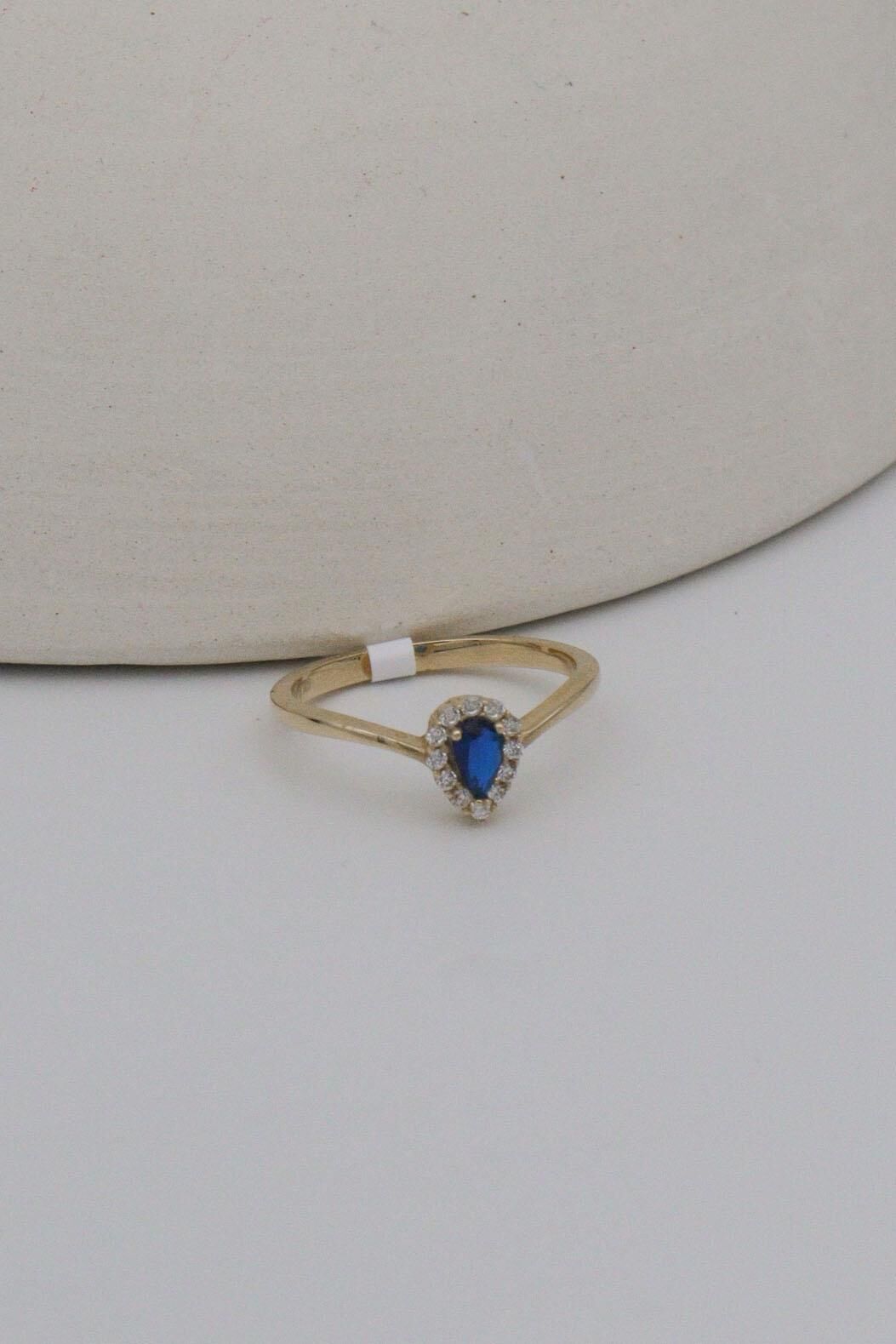 Mavi Damla Taşlı 14 Ayar Altın V Yüzük